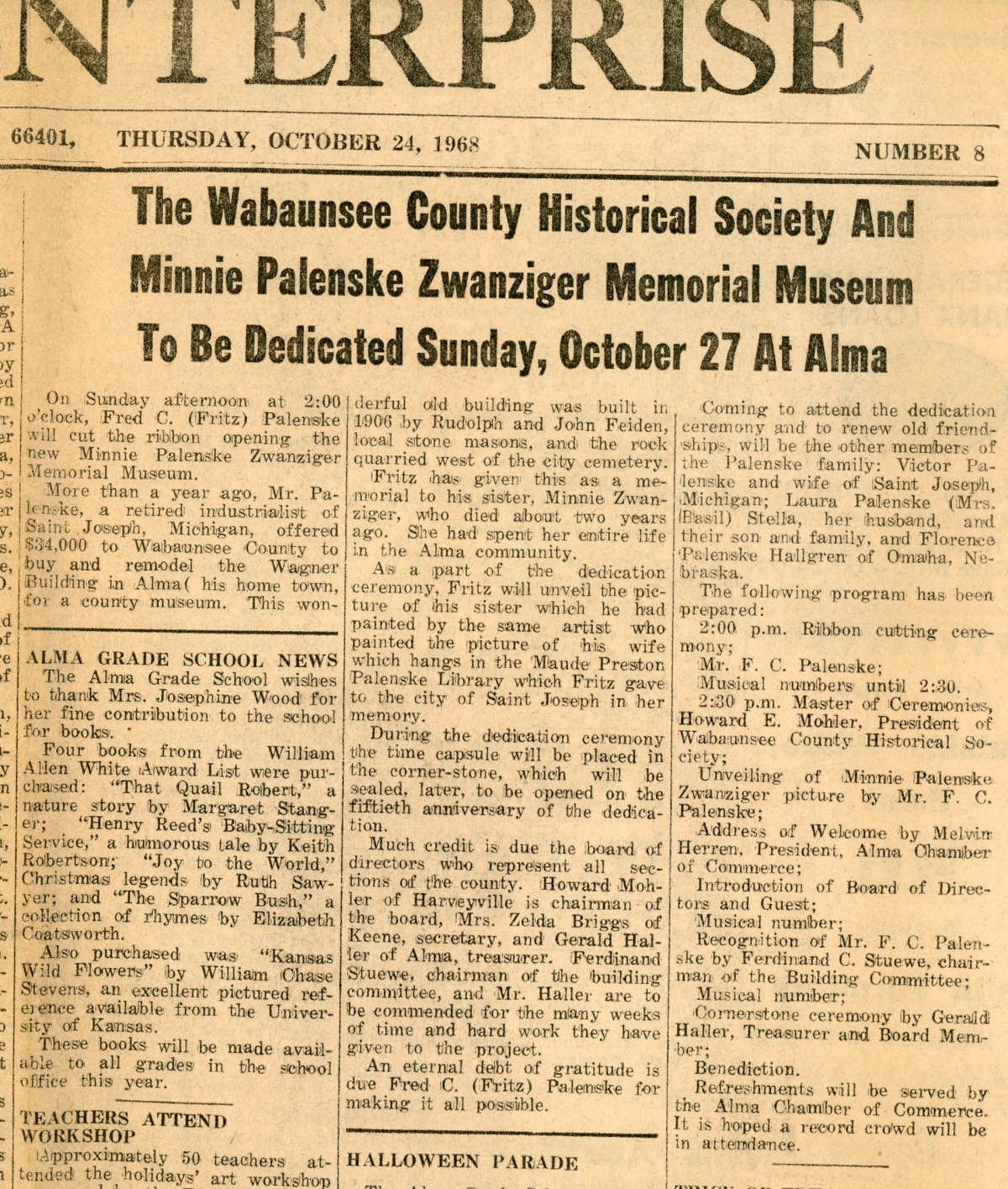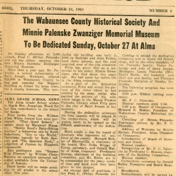 The Alma Signal-Enterprise of October 24, 1968 announced the forthcoming dedication of the Minnie Palenske Zwanziger Memorial Museum in Alma.