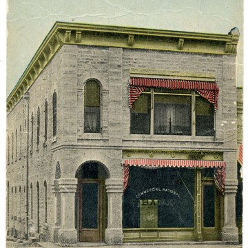 This colorized real photo postcard of the Commercial National Bank in Alma, Kansas dates from about 1907.