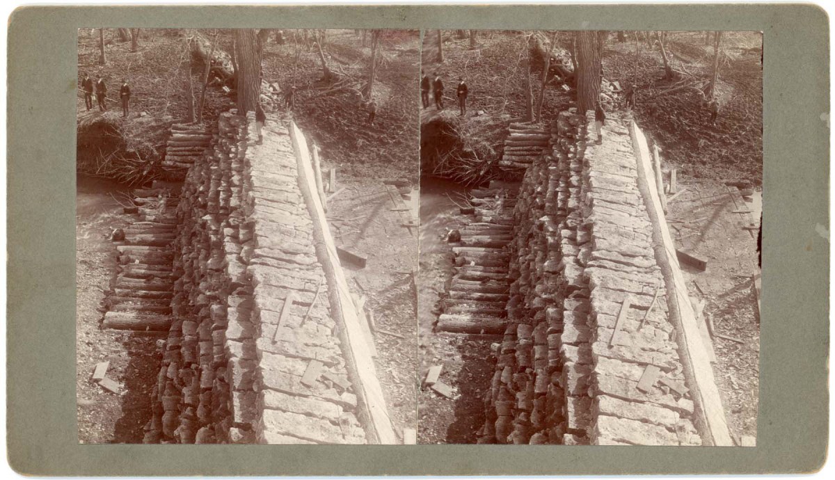 The new upper dam at Palenske’s flour mill was photographed as a stereo view by Alma photographer Gus Meier, circa 1905.