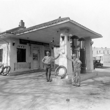 This 1928 photograph shows the White Eagle gas station located at 301 Missouri Street in Alma, Kansas. Seen here are Ronald Faulke (left), operator of the station and Elmer Ringel, station employee. The station was owned by the Degenhardt family for a half-century. Photo courtesy Dr. and Mrs. Larry Ringel.