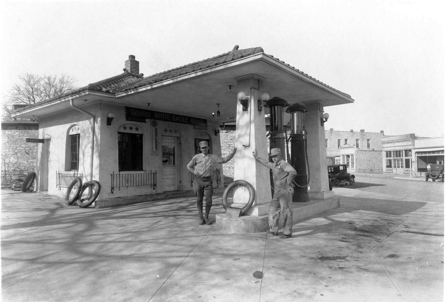 This 1928 photograph shows the White Eagle gas station located at 301 Missouri Street in Alma, Kansas. Seen here are Ronald Faulke (left), operator of the station and Elmer Ringel, station employee. The station was owned by the Degenhardt family for a half-century. Photo courtesy Dr. and Mrs. Larry Ringel.