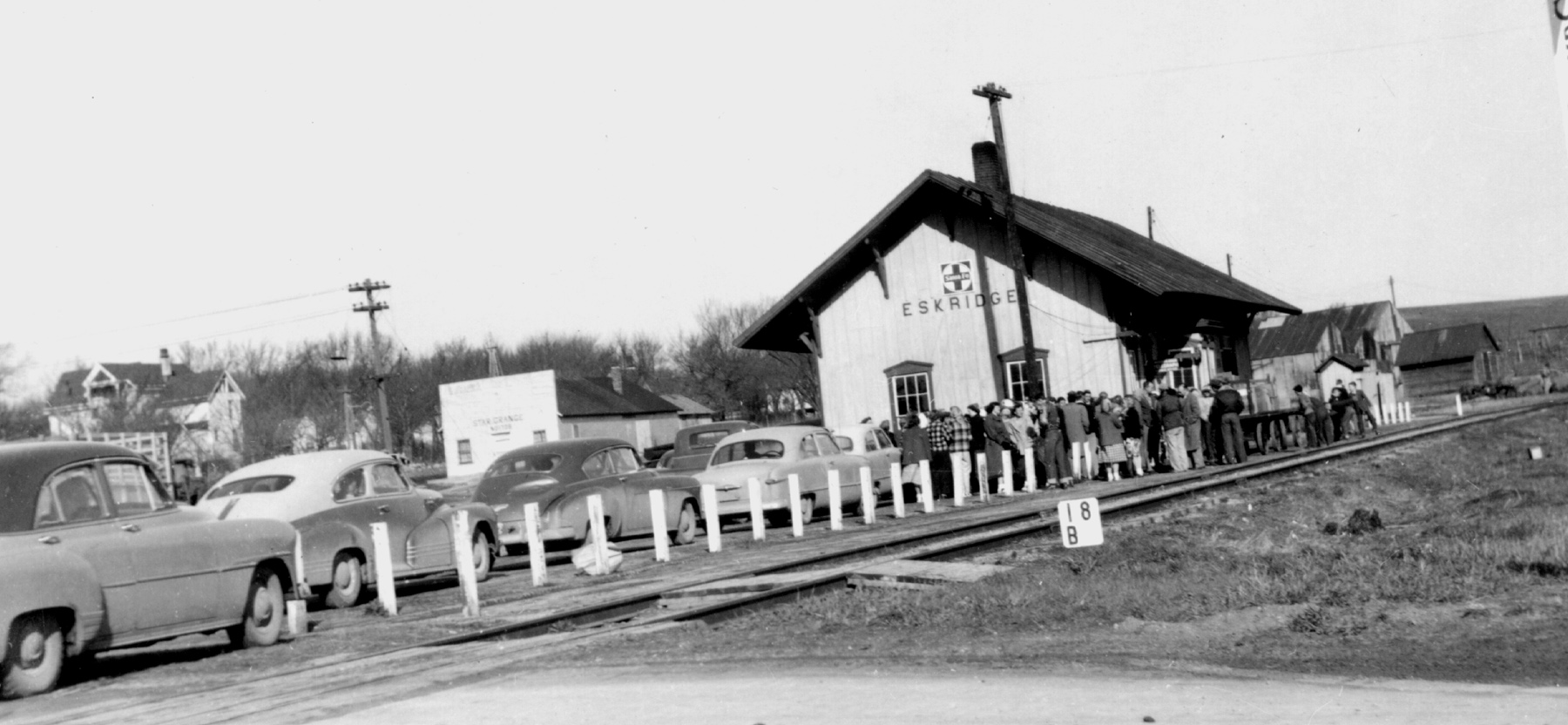 A crowd waits for a train at the Eskridge ATSF depot in this early 1950s photograph. Notice the Eskridge Star Grange to the left of the depot in this view and Dr. Coffey’s house at the far left.