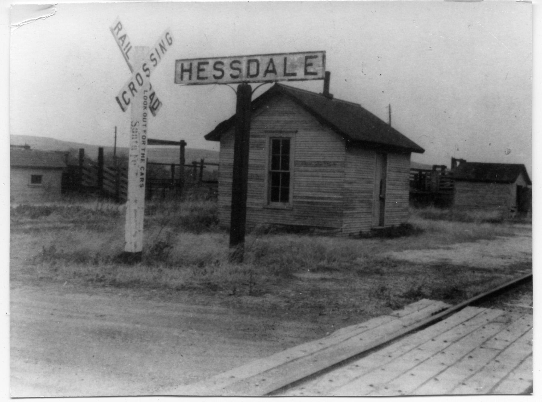 The Hessdale ATSF depot and stockyards are seen in this photograph taken in 1960 at the crossing of Hessdale Road and the railroad track.