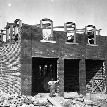 Construction began on the Kratzer Brothers’ Mercantile at Volland, Kansas in 1912 and the store opened for business in October of 1913. A mason is seen here, standing in front of the brick framework of the store.