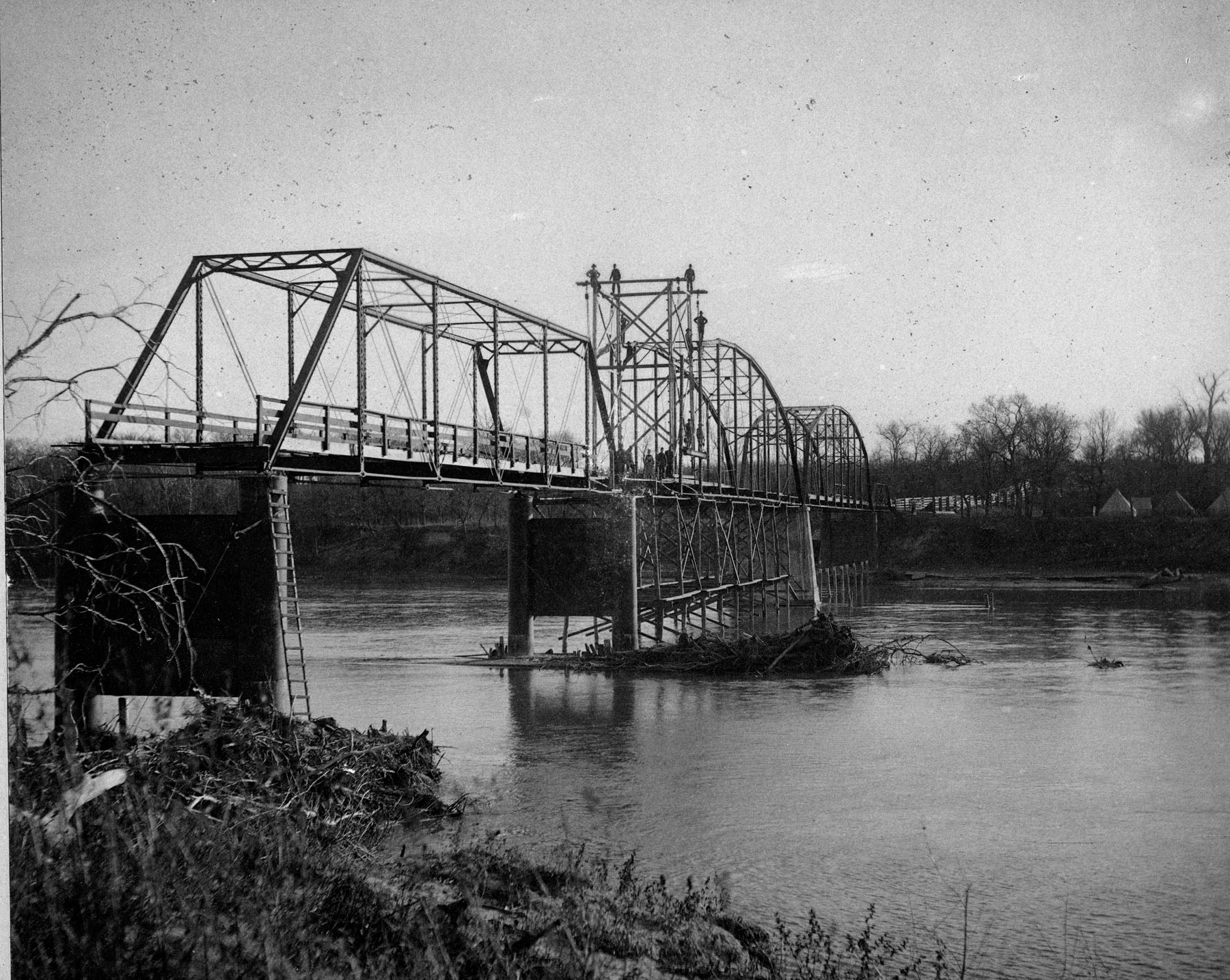 A bridge-building crew working on a bridge spanning the Kansas River north of Maple Hill stand atop the structure. Notice that the approach at the far left is unfinished.