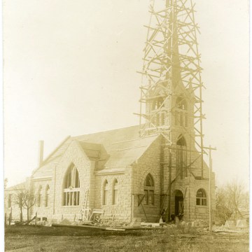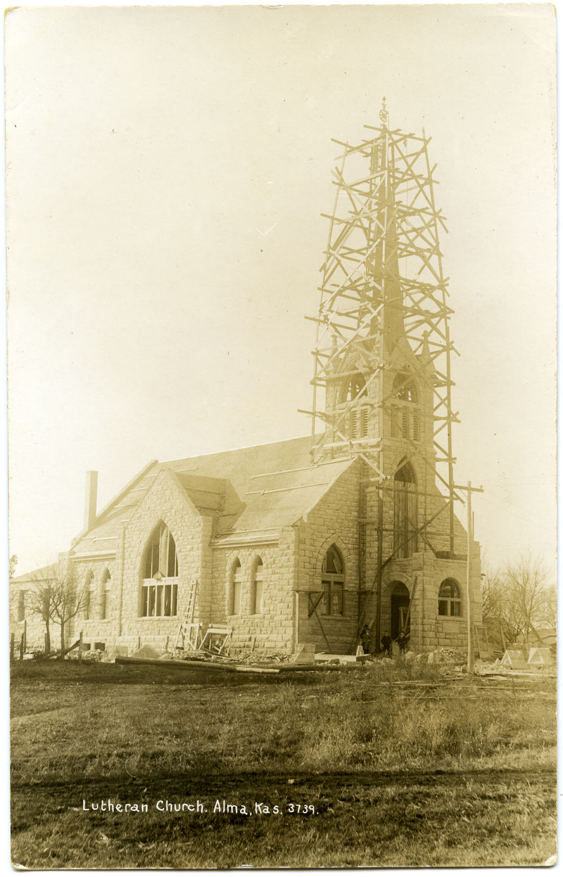 The new St. John Lutheran Church was under construction when this 1908 real photo postcard image was taken. Notice that the windows had not been installed, nor the spires along the roofline. Photo Courtesy St. John Lutheran Church.
