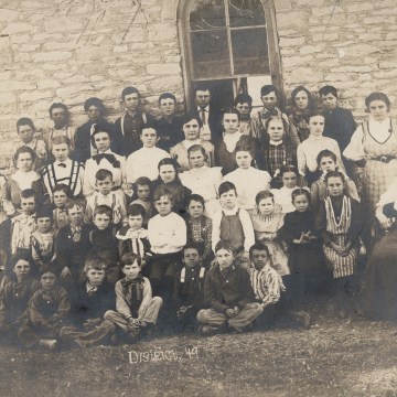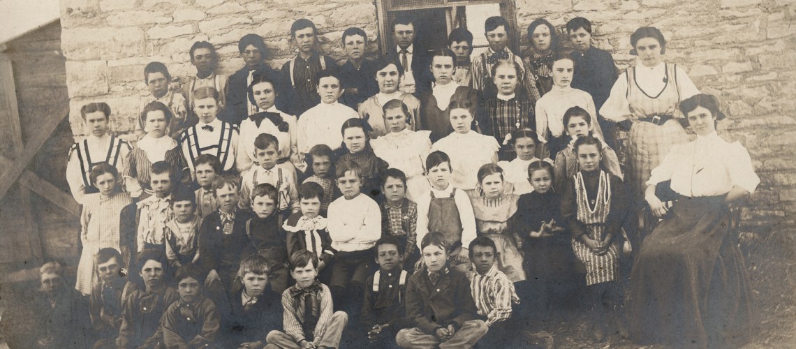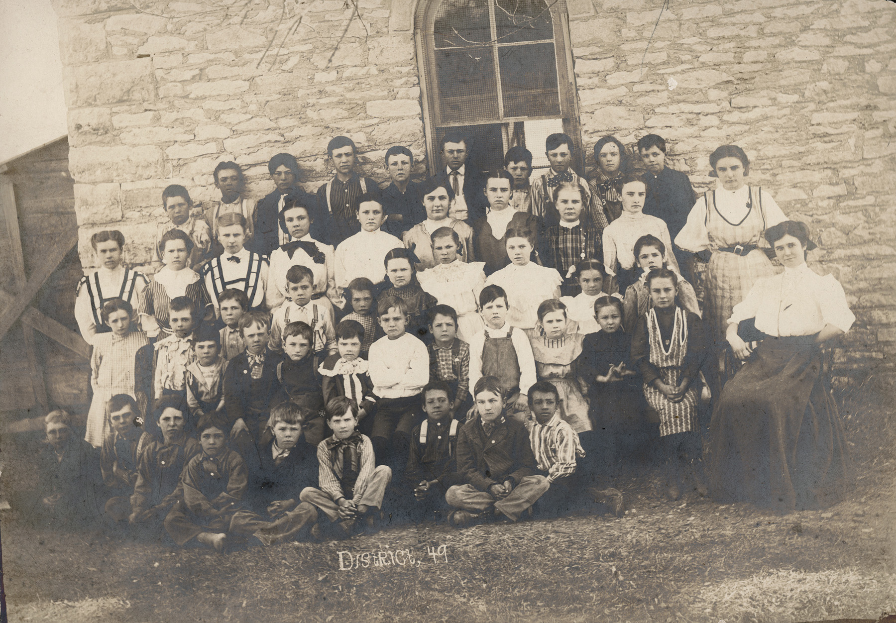 Students from District 49 Mission View School pose for their school photo at the side of the schoolhouse. District 49 was located in the northwest corner of Mission Creek Township.