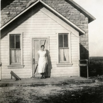 District 50 school teacher, Mary Tanyer stands in front of the Mission View school, located in the southwestern edge of Mission Creek Township.