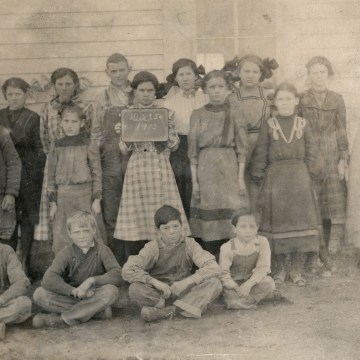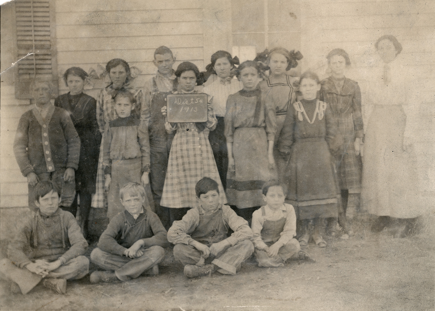 Students from District 54, the Mainey School pose by their schoolhouse for their 1913 school photo. District 54 was located at the far north border of Kaw Township.