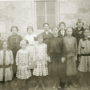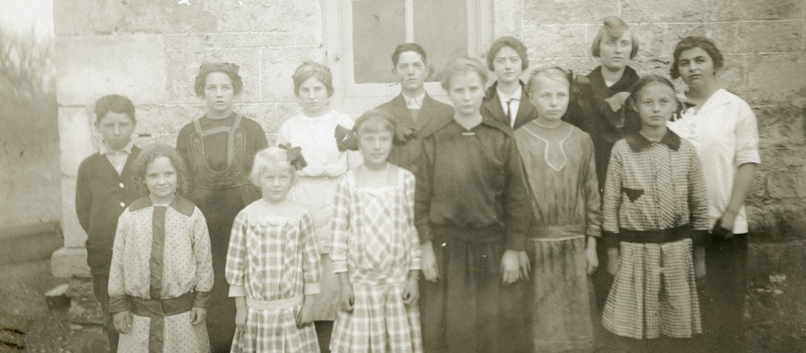 Students from the Haller School, District 76, stand beside the schoolhouse located two miles south of Alma.
